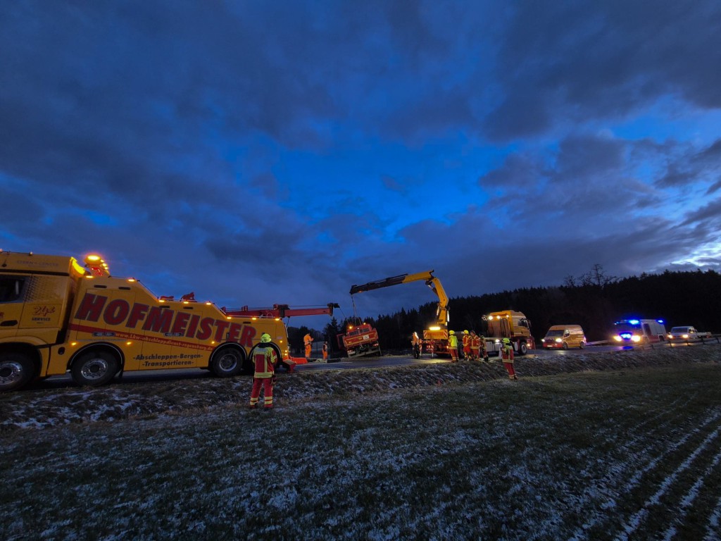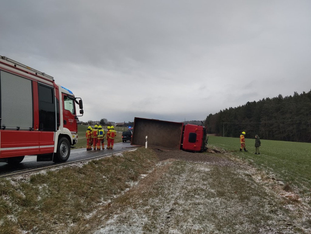 Zu einem Verkehrsunfall mit LKW wurden die Feuerwehren aus Bernhardswald und Hauzendorf gemeinsam mit Kreisbrandmeister Martin Bosl sowie dem Rettungsdienst am gestrigen Nachmittag gegen 16:30 Uhr auf die Kreisstraße R6 zwischen Bernhardswald und Wolferszwing alarmiert. Beim Eintreffen der ersten Einsatzkräfte bestätigte sich die gemeldete Lage. Ein LKW mit Pritsche war bei winterlichen Verhältnissen alleinbeteiligt von der Fahrbahn abgekommen und kam schließlich in Seitenlage neben der Straße zum Liegen. Beide Insassen konnten das Fahrzeug bereits vor Eintreffen der Feuerwehren unverletzt verlassen, wurden jedoch trotzdem vorsorglich durch den Rettungsdienst mit HvO betreut. Durch die eingesetzten Feuerwehren wurde nachfolgend die Unfallstelle abgesichert, der Brandschutz sichergestellt sowie der verunfallte LKW auf auslaufende Betriebsstoffe kontrolliert. Da frühzeitig klar war, dass zur Bergung des Fahrzeugs eine Fachfirma erforderlich sein würde, wurde im weiteren Einsatzverlauf die Feuerwehr Kreuth zur Einrichtung einer Vollsperrung der R6 ab der Abzweigung Stockhof nachalarmiert. Während das HLF zur Unterstützung der Bergungsarbeiten an der Einsatzstelle verblieb, konnten das Mehrzweckfahrzeug sowie das Tanklöschfahrzeug nach etwas mehr als einer Stunde aus dem Einsatz herausgelöst werden und die Einsatzbereitschaft im Gerätehaus wiederherstellen. Die Kreisstraße blieb für die Dauer der Unfallaufnahme und der anschließenden Bergungsmaßnahmen bis etwa 19:00 Uhr vollständig gesperrt. Der entstandene Sachschaden beläuft sich nach Angaben der Polizei auf rund 4000€.