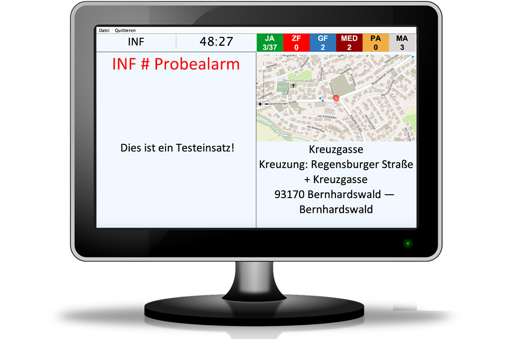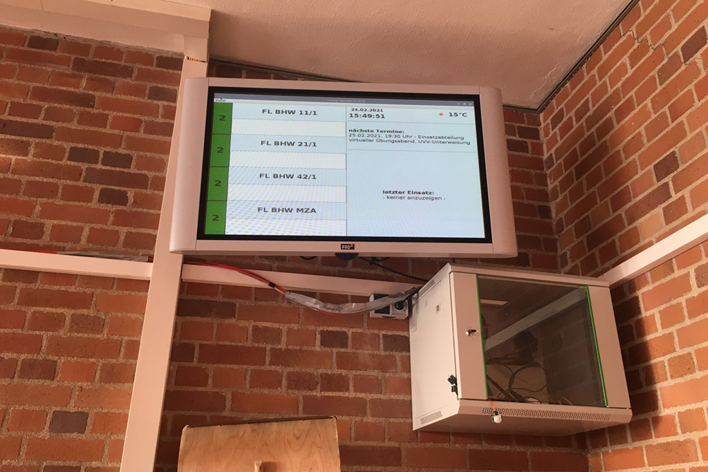 Der neue Anbieter bietet zwar auch die Möglichkeit, die Einsatzdaten auf einem Monitor anzuzeigen, doch setzt die FF Bernhardswald bereits seit anderthalb Jahren auf eine eigens für sie erstellte und angepasste Software, entwickelt durch einen Informatik-Studenten aus den eigenen Reihen. Dieses System war bisher dafür verantwortlich, die Alarmdepesche als Fax in digitalen Text umzuwandeln und dann die wichtigsten Informationen aufbereitet am Monitor darzustellen. Dazu zählen Stichwort, Schlagwort, Bemerkung der Leitstelle und natürlich die Örtlichkeit, deren Koordinaten auf einer Karte markiert werden. Durch eine Schnittstelle zu blaulichtSMS konnte dieses bestehende System insofern erweitert werden, dass es nun die Einsatzdaten vom neuen Anbieter bezieht, wozu auch die abgegebenen Rückmeldungen zählen. Besteht aus bestimmten Gründen keine Verbindung zur Anbieterschnittstelle, wird wie gehabt das eingehende Alarmfax für die Einsatzanzeige verwendet. Ausgedruckt wird die Alarmdepesche weiterhin für jedes Fahrzeug, eine Ausstattung derer mit Tablets ist jedoch vorgesehen. Um einen möglichen Stromausfall wie durch Unwetterlagen zu kompensieren, hängt das System an einer unabhängigen Stromversorgung (USV). Im Ruhezustand dient der Monitor als schwarzes Brett, auf dem aktuelle Informationen zu den Fahrzeugen vermerkt werden bzw. deren Status manuell gesetzt werden können. Beispielsweise kann dort angegeben werden, wenn ein Löschfahrzeug derzeit nicht über Atemschutzgeräte verfügt. Im Einsatzfall wird diese Information dann zusätzlich eingeblendet, um etwa die Fahrzeugwahl positiv zu beeinflussen. Des Weiteren finden sich aktuelle Wetterwarnungen für den Landkreis, die Außentemperatur und nächste Termine wieder. Um Umwelt und Technik zu schonen, ist das System mit einem Bewegungsmelder ausgestattet – befindet sich keine Person mehr im Gerätehaus, wird der Bildschirm nach einer gewissen Zeit wieder ausgeschaltet.