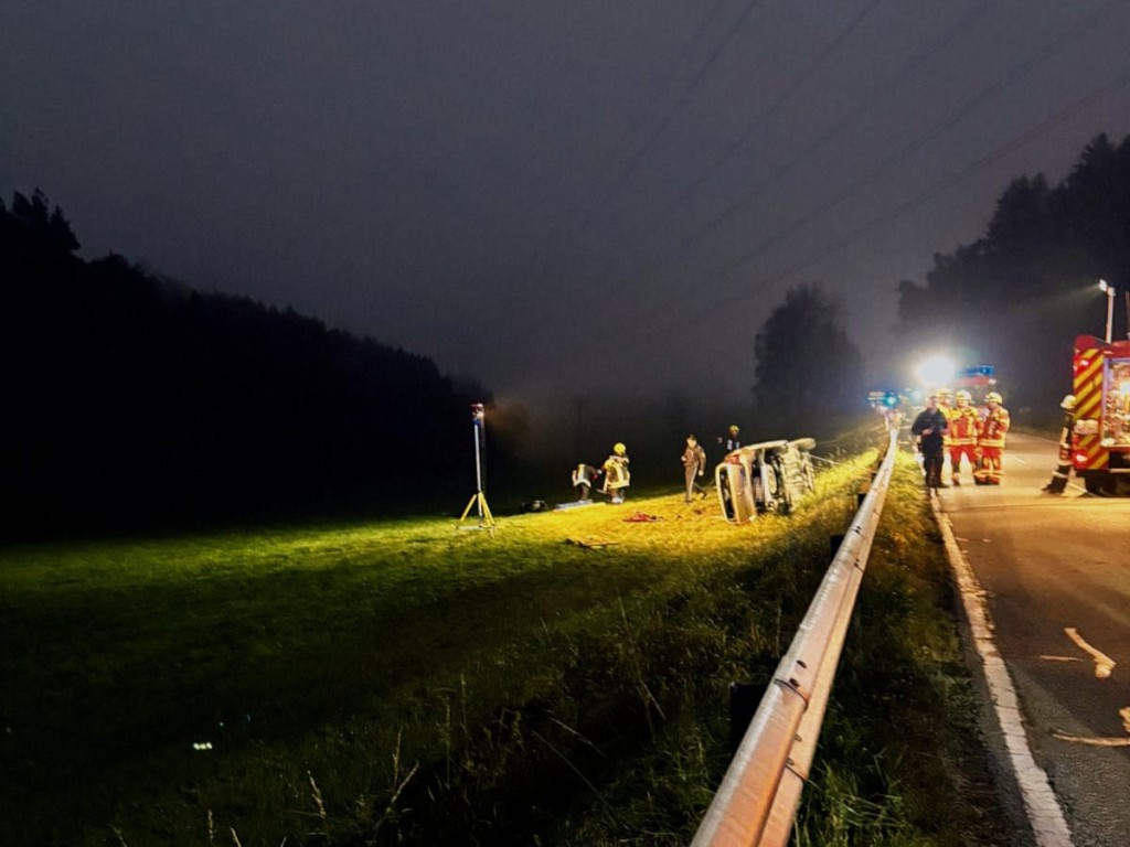 Eine Fahrerin war dort um kurz vor sechs Uhr aus bislang ungeklärter Ursache alleinbeteiligt von der Fahrbahn abgekommen. Das Fahrzeug überschlug sich und kam seitlich in einer angrenzenden Wiese zum Liegen. Nach der ersten Meldung befand sich die Person ansprechbar, jedoch eingeschlossen im Fahrzeug – was sich bei Eintreffen der örtlich zuständigen Kräfte aus Altenthann bestätigte. In Absprache mit dem Einsatzleiter übernahm das Bernhardswalder HLF gemeinsam mit den ersteintreffenden Kräften die Rettungsmaßnahmen. Hierbei wurde das Fahrzeug zunächst mittels StabFast – einem Abstützsystem zur schnellen und sicheren Stabilisierung von verunfallten Fahrzeugen – gesichert. Anschließend entfernten die Einsatzkräfte die Frontscheibe, um einen patientenschonenden Zugang zu schaffen. Die Fahrerin konnte daraufhin zügig aus dem Fahrzeug befreit und an den bereitstehenden Rettungsdienst übergeben werden. Parallel übernahm das TLF für die Dauer der Rettungsmaßnahmen gemeinsam mit der nachalarmierten Feuerwehr Lichtenwald die Vollsperrung der R25.
