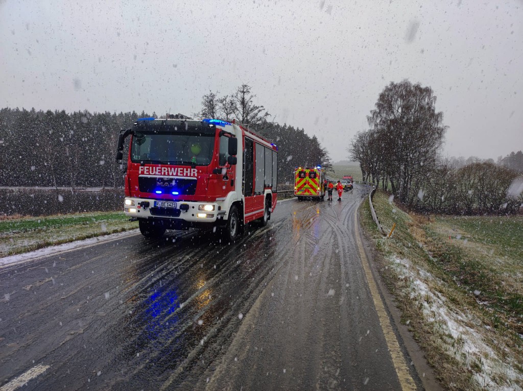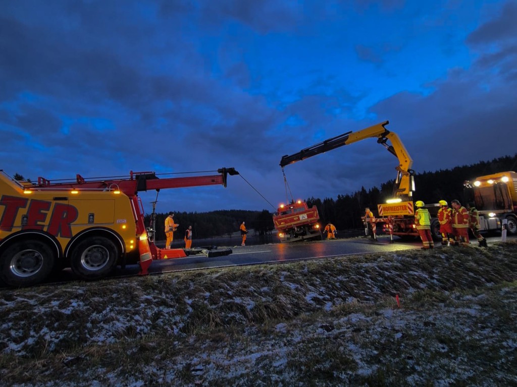 Zu einem Verkehrsunfall mit LKW wurden die Feuerwehren aus Bernhardswald und Hauzendorf gemeinsam mit Kreisbrandmeister Martin Bosl sowie dem Rettungsdienst am gestrigen Nachmittag gegen 16:30 Uhr auf die Kreisstraße R6 zwischen Bernhardswald und Wolferszwing alarmiert. Beim Eintreffen der ersten Einsatzkräfte bestätigte sich die gemeldete Lage. Ein LKW mit Pritsche war bei winterlichen Verhältnissen alleinbeteiligt von der Fahrbahn abgekommen und kam schließlich in Seitenlage neben der Straße zum Liegen. Beide Insassen konnten das Fahrzeug bereits vor Eintreffen der Feuerwehren unverletzt verlassen, wurden jedoch trotzdem vorsorglich durch den Rettungsdienst mit HvO betreut. Durch die eingesetzten Feuerwehren wurde nachfolgend die Unfallstelle abgesichert, der Brandschutz sichergestellt sowie der verunfallte LKW auf auslaufende Betriebsstoffe kontrolliert. Da frühzeitig klar war, dass zur Bergung des Fahrzeugs eine Fachfirma erforderlich sein würde, wurde im weiteren Einsatzverlauf die Feuerwehr Kreuth zur Einrichtung einer Vollsperrung der R6 ab der Abzweigung Stockhof nachalarmiert. Während das HLF zur Unterstützung der Bergungsarbeiten an der Einsatzstelle verblieb, konnten das Mehrzweckfahrzeug sowie das Tanklöschfahrzeug nach etwas mehr als einer Stunde aus dem Einsatz herausgelöst werden und die Einsatzbereitschaft im Gerätehaus wiederherstellen. Die Kreisstraße blieb für die Dauer der Unfallaufnahme und der anschließenden Bergungsmaßnahmen bis etwa 19:00 Uhr vollständig gesperrt. Der entstandene Sachschaden beläuft sich nach Angaben der Polizei auf rund 4000€.