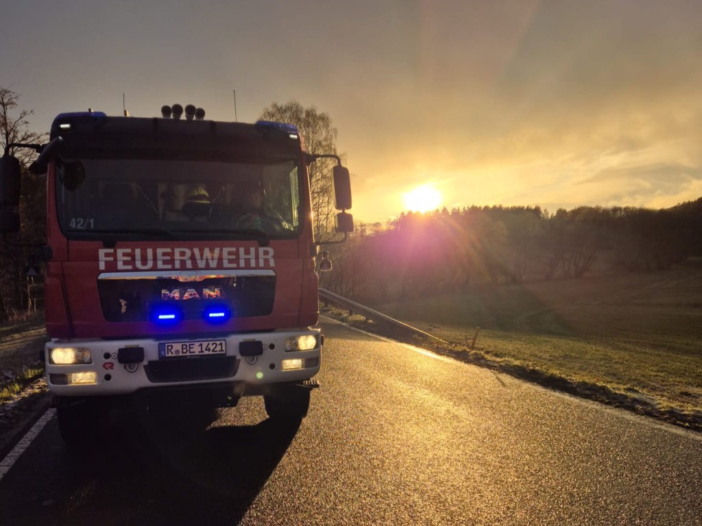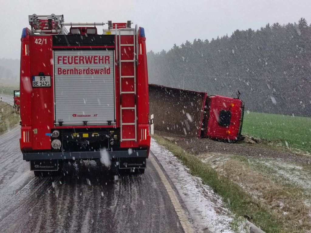Zu einem Verkehrsunfall mit LKW wurden die Feuerwehren aus Bernhardswald und Hauzendorf gemeinsam mit Kreisbrandmeister Martin Bosl sowie dem Rettungsdienst am gestrigen Nachmittag gegen 16:30 Uhr auf die Kreisstraße R6 zwischen Bernhardswald und Wolferszwing alarmiert. Beim Eintreffen der ersten Einsatzkräfte bestätigte sich die gemeldete Lage. Ein LKW mit Pritsche war bei winterlichen Verhältnissen alleinbeteiligt von der Fahrbahn abgekommen und kam schließlich in Seitenlage neben der Straße zum Liegen. Beide Insassen konnten das Fahrzeug bereits vor Eintreffen der Feuerwehren unverletzt verlassen, wurden jedoch trotzdem vorsorglich durch den Rettungsdienst mit HvO betreut. Durch die eingesetzten Feuerwehren wurde nachfolgend die Unfallstelle abgesichert, der Brandschutz sichergestellt sowie der verunfallte LKW auf auslaufende Betriebsstoffe kontrolliert. Da frühzeitig klar war, dass zur Bergung des Fahrzeugs eine Fachfirma erforderlich sein würde, wurde im weiteren Einsatzverlauf die Feuerwehr Kreuth zur Einrichtung einer Vollsperrung der R6 ab der Abzweigung Stockhof nachalarmiert. Während das HLF zur Unterstützung der Bergungsarbeiten an der Einsatzstelle verblieb, konnten das Mehrzweckfahrzeug sowie das Tanklöschfahrzeug nach etwas mehr als einer Stunde aus dem Einsatz herausgelöst werden und die Einsatzbereitschaft im Gerätehaus wiederherstellen. Die Kreisstraße blieb für die Dauer der Unfallaufnahme und der anschließenden Bergungsmaßnahmen bis etwa 19:00 Uhr vollständig gesperrt. Der entstandene Sachschaden beläuft sich nach Angaben der Polizei auf rund 4000€.